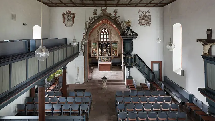 Wer in unsere Kirche tritt, hebt beim Hereintreten durch die Seitentür oft den Blick, überwältigt durch die Weite, die sich bietet. Mit „Oh!“ und „Ah!“ treten neue „Passagiere“ in unser Kirchenschiff und sind überrascht, was sie zu sehen bekommen. Zunächst einmal fällt die Helligkeit in dem Raum auf. Die dominierenden Farben sind Sandstein, hellblau und weiß. Die Bodenplatten sind alt, aber begehbar, die Wege sind breit und selbst der Aufgang zur Empore bietet Bewegungsfreiheit. Die Orgel, nun auch schon wieder 50 Jahre alt, überragt das Oberdeck.. Von oben gibt es einen herrlichen Überblick zur Ostwand hin: Links das Wappen von Löwenstein-Wertheim-Rosenberg, dazwischen der Blick in den Chorraum mit seinem Altar, rechts das Erbacher Wappen. Erst auf den zweiten Blick fällt auf, unter welcher Flagge das Schiff fährt: Seitlich hängt der Gemarterte, über-lebensgroß, aber authentisch als Leichnam dargestellt. Handwerkskunst des 15. Jahrhunderts. Manch einen gruselt es , wenn der Schmerzensmann so halb über einem hängt. Und daran ändern auch die fehlenden Bänke nichts: Diese wurden nicht etwa zum Verfeuern verbannt (es gibt sie noch!), sondern ermöglichen eine flexiblere Bestuhlung. Vor allem auf der rechten Seite entsteht dadurch Platz – sei es für Musiker, für Kinder (und den dazu ausgerollten dicken Teppich unter der Kanzel) oder aber für die besondere Sitzordnung an Kareitag.  Da widmet sich die ganze Gemeinde dem Gekreuzigten – Grusel hin oder her. Als die Kirche 1711 in Brand geriet, hätte wohl niemand gedacht, dass diese alte Mauern, gebaut noch vor der Reformation aus den Steinen der alten Burg, je wieder in diesem Glanz aufgerichtet werden würden. Zwar waren Turm und Chrorraum noch intakt, doch das Langhaus hatte stark gelitten. So wurde der spätgotische Bau in seiner Mitte barock wieder aufgebaut. Dieses Erscheinungsbild prägt die Kirche bis heute. Kanzel und Taufstein tragen ebenfalls die Spuren des Barock, in beiden Werken zeigt sich örtliche Handwerkskunst. Über den Taufengel gibt es eine Rechnung die nach Erbach führt, ein sehr ähnliches Exemplar steht in Vielbrunn. Der Schalldeckel über der Kanzel (zur besseren Akustik, damals hieß Tontechnik noch „Töpfern“) wird von einem vermeindlichen Pelikan geziert: Diesem wurde bisweilen nachgesagt, er nähre seine Jungen durch sein eigenes Blut. Ein Sinnbild für den sterbenden Christus. Wie wir es deuten sollen, dass der Pelikan seine Jungen  ganz lapidar aus seinem Schnabel füttert und zudem unser Pelikan ein Schwan ist, darauf dürfen sich die Kirchenraumbesucher ihren eigenen Reim machen. Eher eindeutig ist die Symbolsprache des Lebensbaumes unter der Empore. Verstorbenen und Getauften gleichermaßen wird zugesagt: „Ich habe dich erlöst. Ich habe dich bei deinem Namen gerufen, du bist mein!“ (Jes. 43, 1). Denn das Getauft-Sein endet nicht mit dem Tod, darum braucht uns auch der auf der Gegenseite dargestellte Leichnam nicht zu schrecken. Neben den grünen Kärtchen der Getauften am Baum stehen die Kerzen der Konfirmanden, wie die Taufkerzen auch werden sie an der Osterkerze entzündet. Das Leben ist nun mal stärker als der Tod, so, wie das Licht stärker ist als die Dunkelheit. Dafür stehen wir als Kirche Christi ein, und das bezeugen wir auch in unseren „Heiligen Hallen“. Sinnliche Lebensfreude gibt es im Mittelgang: Dort stehen nach dem Gottesdienst ausreichend Tassen und warme Getränke bereit, außerdem Freiwillige, die mit ihrem Engagement die Gastfreundlichkeit unseres Hauses ausdrücken. An dieser Stelle ein ganz herzliches Danke! Für jüngere Gottesdienstteilnehmer gibt es zudem die Bücherkiste, die allerlei Kurzweil verspricht. Wenn auch Ältere etwas lesen möchten: Bibeln liegen bereit, und auch das Gesangbuch im mobilen Regal bietet Lesefutter: Lieder, Texte, unser Katechismus (suchen Sie sich einen aus!) und Gebete, aber auch allerlei Wissenswertes über die Tradition in unseren Kirchen. Wer mehr was fürs Auge möchte kann auch einen Leporello erwerben, wahlweise auch eine Kerze mit unserem Altar oder eine Bibelübersetzung im heutigen Deutsch. Der Wortherkunft nach beschreibt ein „Schiff“ einen schützenden Hohlkörper, verwandt mit dem Wort „Krippe“. Waren Kirchen früher oft Schutzräume (gemauert im Gegensatz zu den Wohnhäusern) gegen äußerliche Feinde, wurden sie schon bald als Heilige Schutzräume verstanden, die ein besonderes Benehmen abverlangen. Muss man in einer Kirche leise sein? Ich meine, man darf zumindest laut singen! Probieren Sie es doch mal aus mit dem Lied aus der Überschrift. Es steht zwar unter der Rubrik „Advent“, ist aber auch ein Passionslied. Schauen sie selbst nach, Sie kennen sich ja jetzt aus!