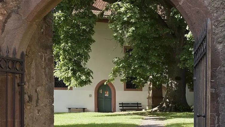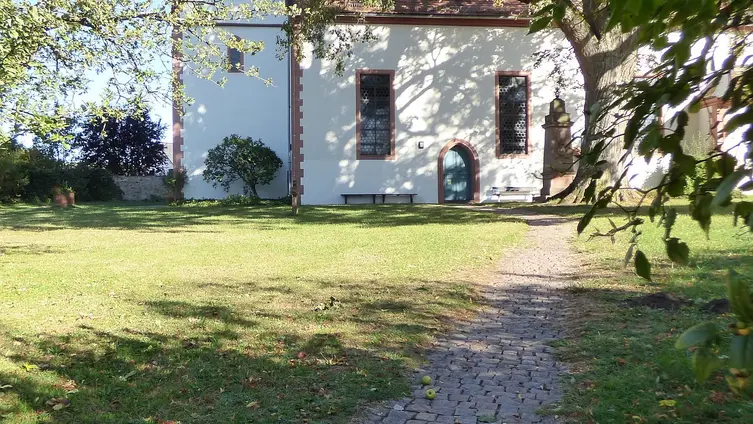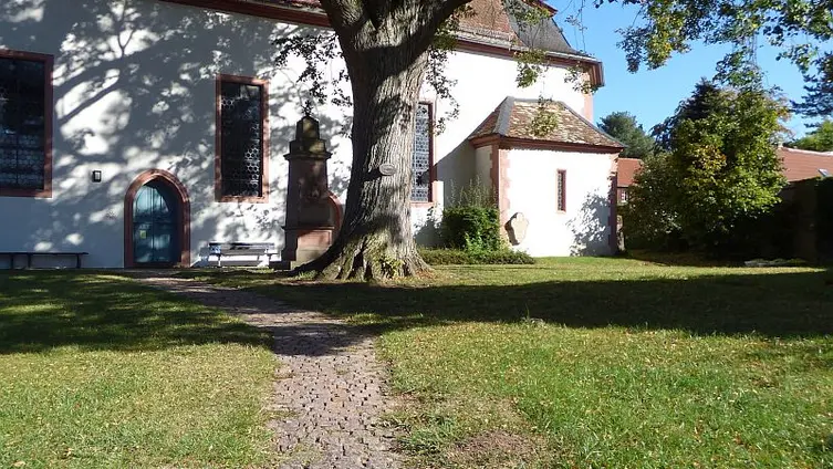 Wie es sich gehört für eine alte Kirche ist sie von Gräbern umgeben, gleichwohl wird dort längst nicht mehr bestattet. Grabsteine finden sich noch immer dort, wer von der Hauptstraße die Treppe hoch steigt und durch den Bogen tritt erblickt einen links des Weges mitten auf der Wiese. Er stammt aus dem 18. Jahrhundert. Weitere Grabsteine stehen entlang der alten Mauer, vor allem auf der Seite zum Burghof hin. Die Mauer selbst ist wesentlich älter, wie überhaupt das ganze Areal schon sehr lange befestigt ist. Der Schlussstein im Bogen zur Treppe nach Süden hin trägt die Jahreszahl 1510 (gedeutet mit freundlicher Unterstützung der Damen des Hessisches Staatsarchivs Darmstadt [Internet: https://landesarchiv.hessen.de] !), an der Kirche findet sich rechts vom Turmportal eine 1467.